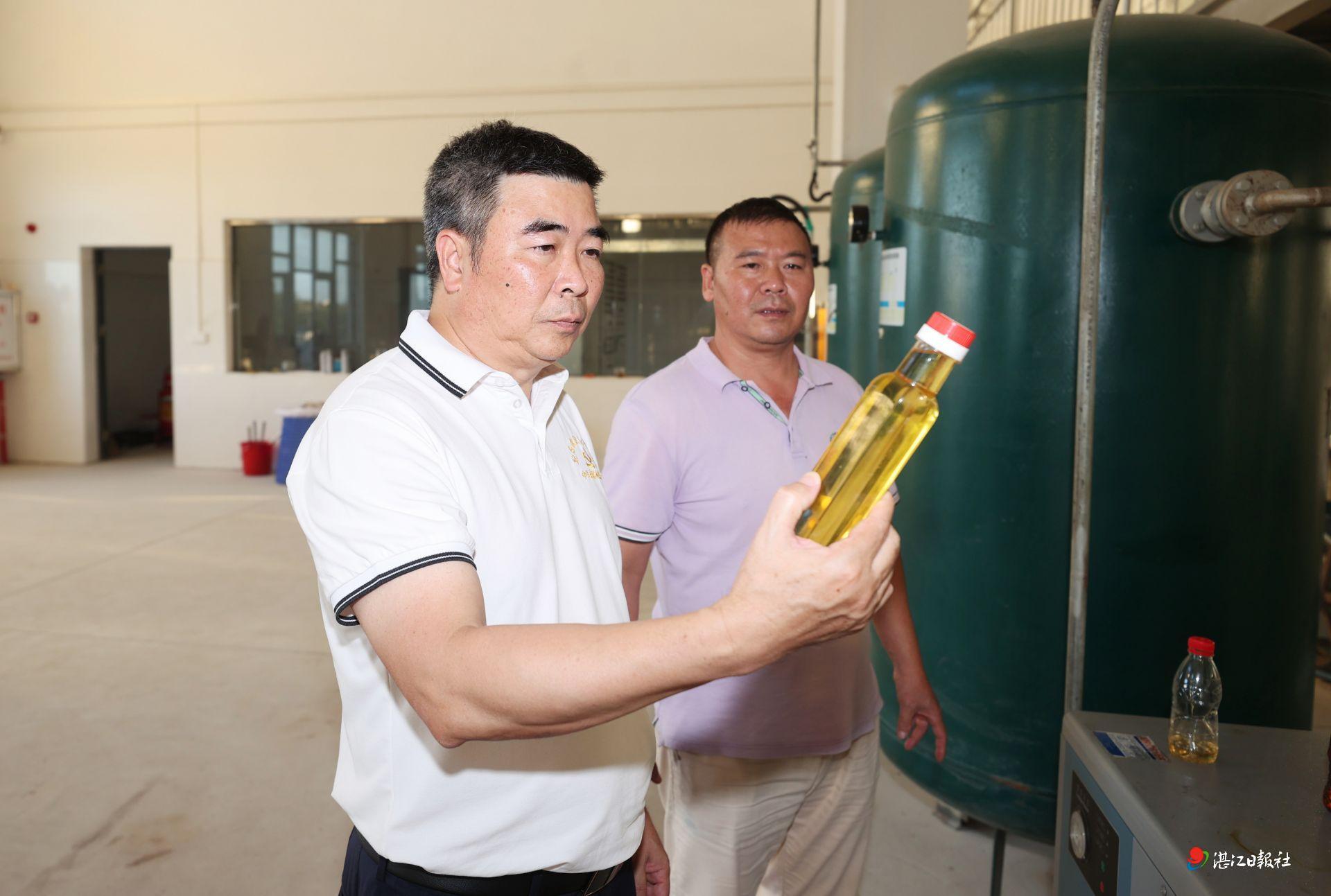 孙茂荣在查看唐基村的花生油压榨厂的产品。记者李忠 摄