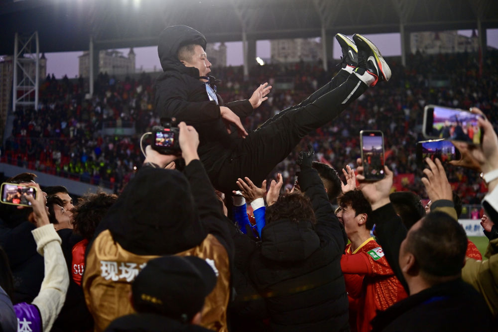 10月26日,辽宁铁人队主教练李金羽(上)在赛后被队员抛向空中庆祝。当日,在辽宁沈阳举行的2025赛季中国足球协会甲级联赛第28轮比赛中,辽宁铁人队1比0战胜南通支云队,提前锁定中甲联赛冠军,并实现冲超目标。新华社记者 吴青昊 摄