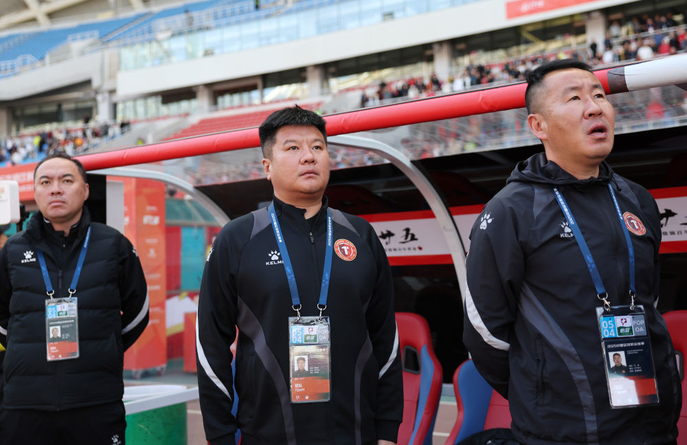 5月4日,辽宁铁人队主教练李金羽(中)在比赛前。当日,在沈阳举行的2025中国足球甲级联赛第七轮比赛中,辽宁铁人队主场2比1战胜陕西联合队。新华社记者 李钢 摄