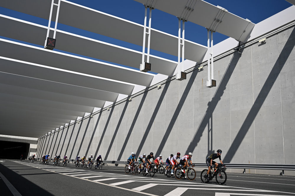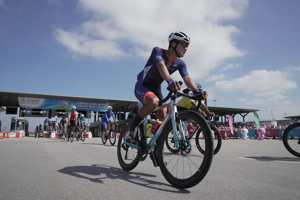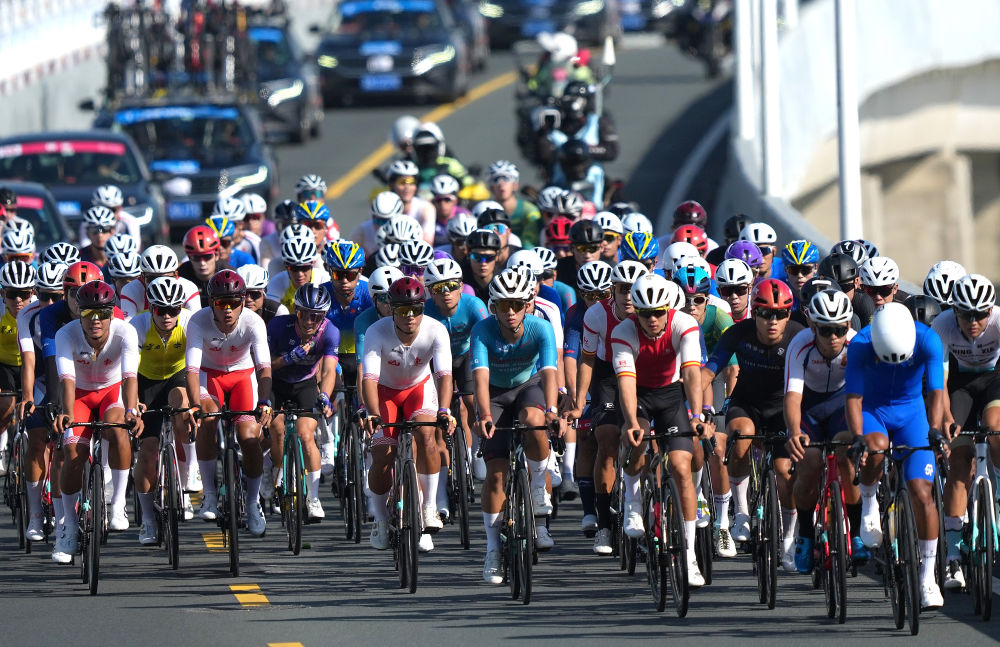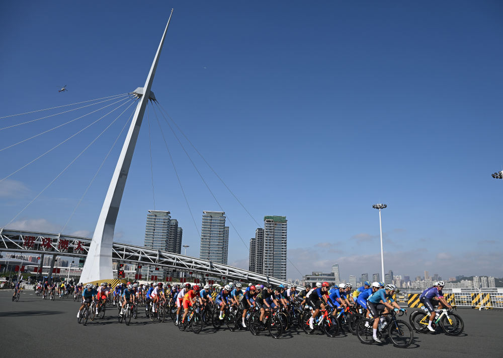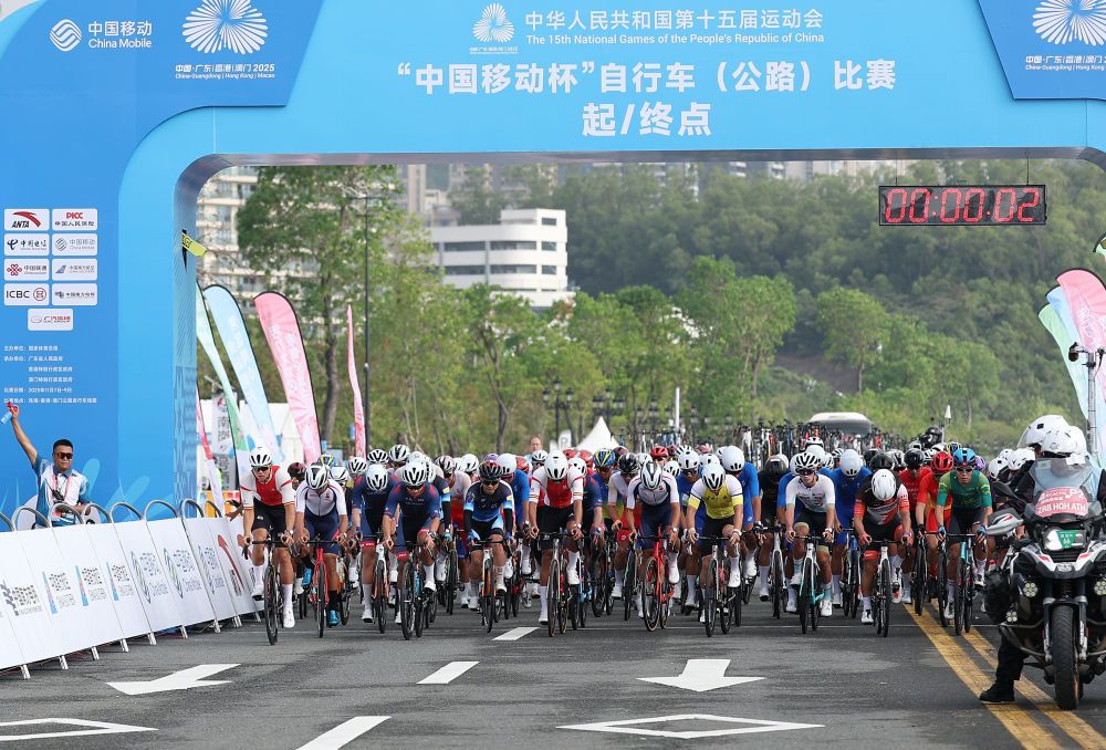 ↑11月8日,选手们在公路自行车男子个人赛决赛中出发。