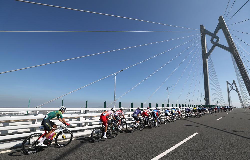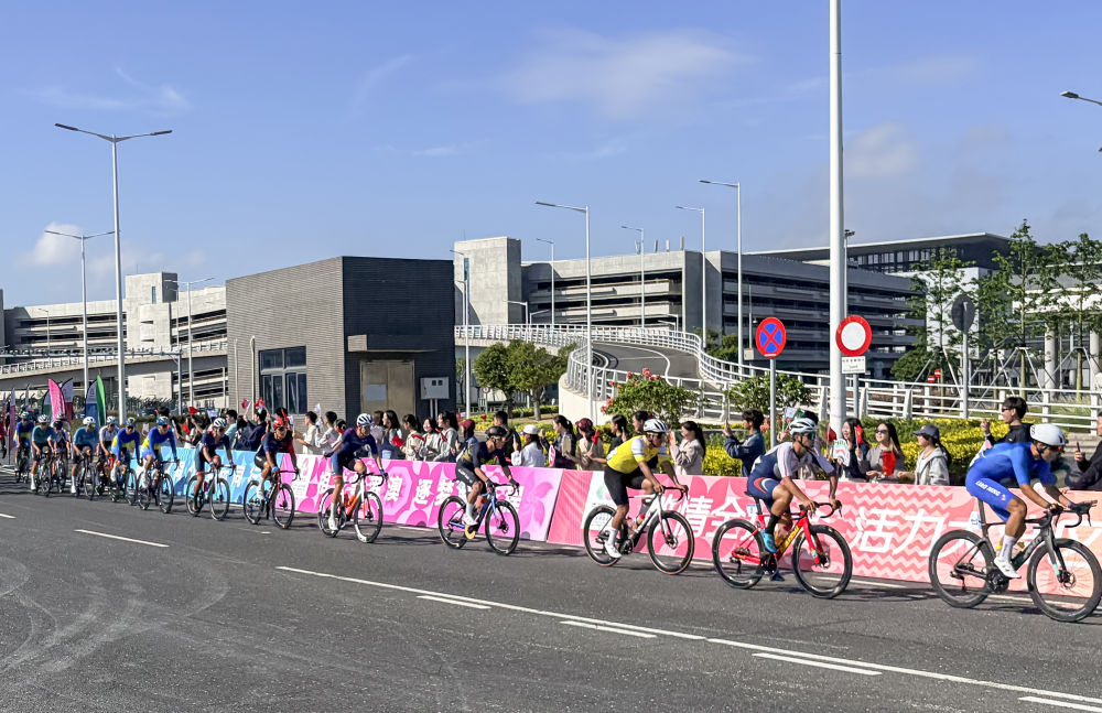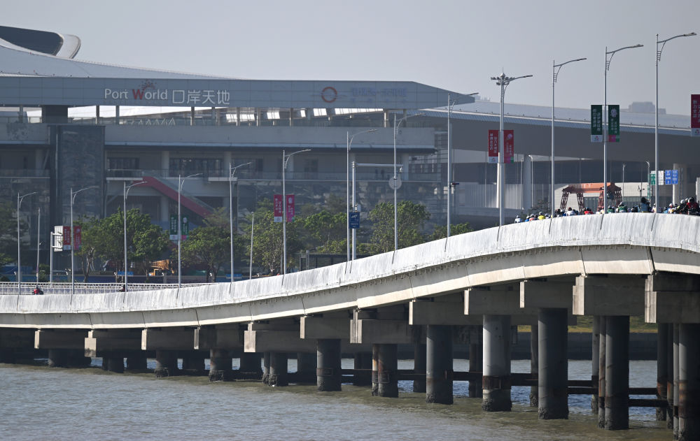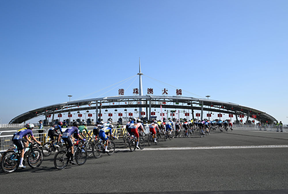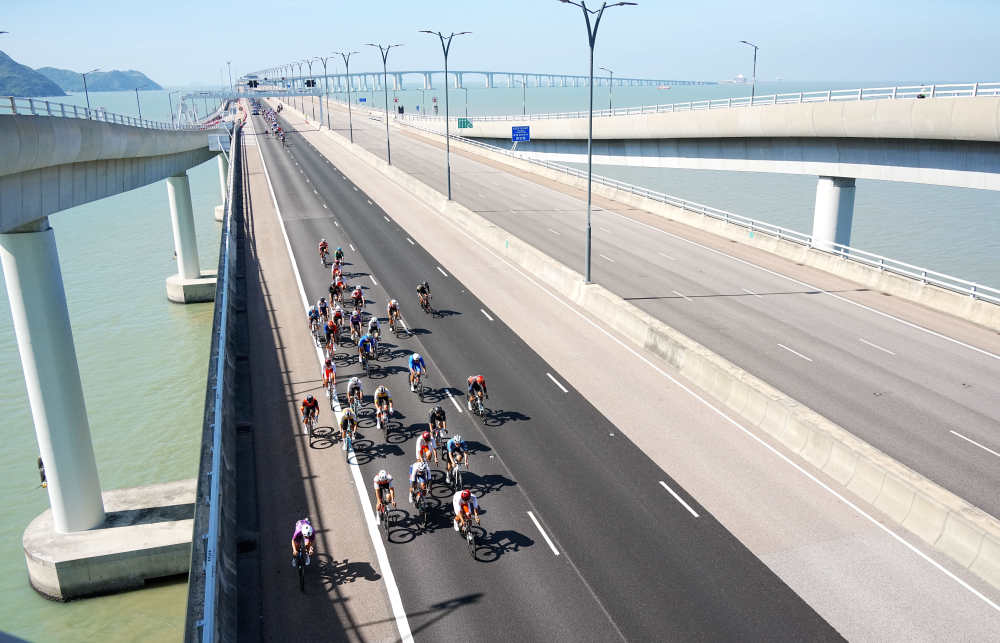 ↑11月8日,选手们骑行经过港珠澳大桥。