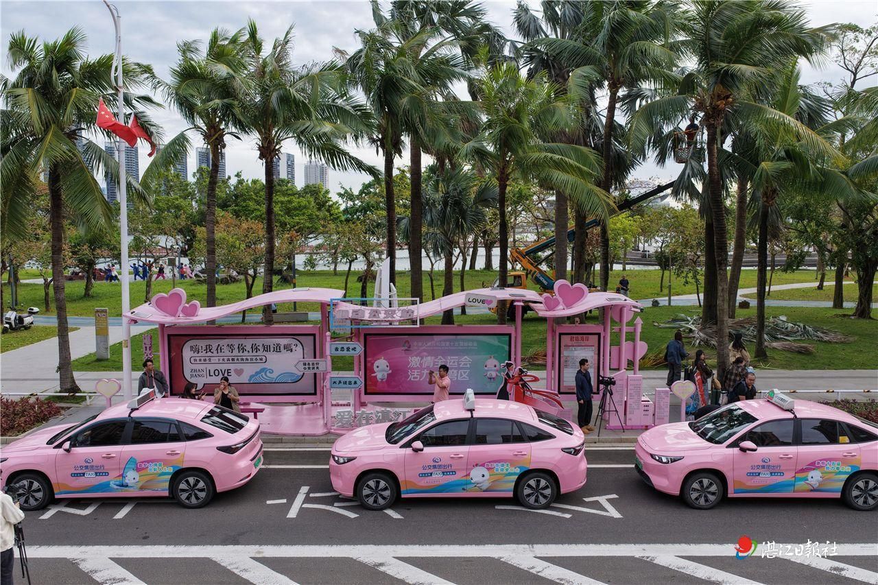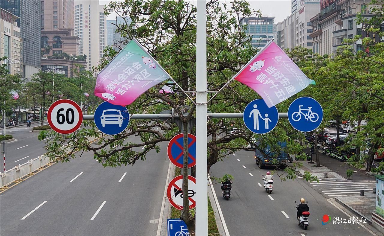 在湛江奥体中心、赤坎金沙湾、渔港公园、湛江市体育中心、霞山国贸商圈、海滨宾馆、经开区乐山大道等处,可以见到“激情全运会 活力大湾区”“相约粤港澳,逐梦新征程”“当好东道主,喜迎十五运”等醒目海报、横幅、彩旗、宣传牌,还有吉祥物中华白海豚“喜洋洋”与“乐融融”可爱的身影,以及全运会元素满满的公交车、出租车、候车亭等,十分吸引眼球,引得广大市民和游客纷纷掏出相机、手机拍照并分享到朋友圈。制作精美的全运会主题产品,让人爱不释手。丰富多彩的全民健身活动,为体育盛会营造了浓郁氛围。