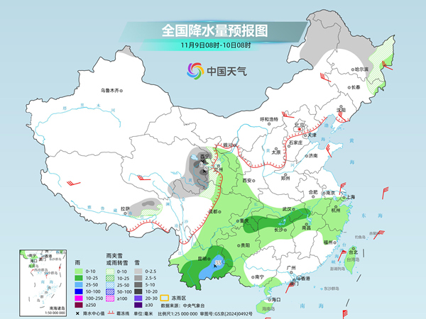 昨天,降雪核心影响区集中在内蒙古东部及东北等地,同时受冷暖空气交汇影响,长江流域降雨发展增多。监测显示, 昨日8时至今日6时,青海东南部、甘肃南部、河北北部、内蒙古东北部、吉林北部和东部、黑龙江等地出现小到中雪或雨夹雪,局地大雪;贵州北部、湖南中北部、江西中北部等地部分地区出现大雨,局地暴雨。