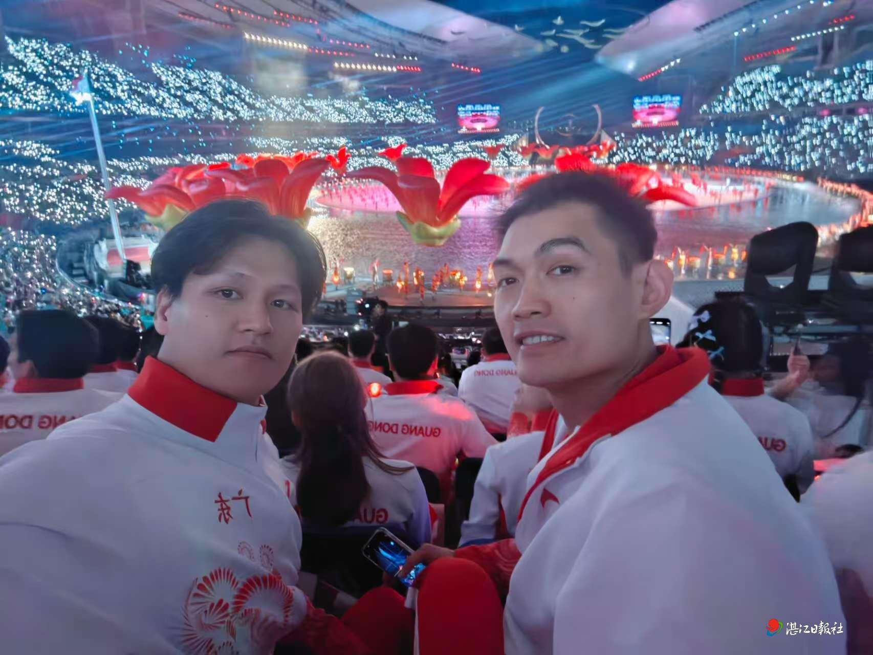 湛江籍水球运动员谭恒业(左)、吴宏辉(右)在十五运会开幕式现场。