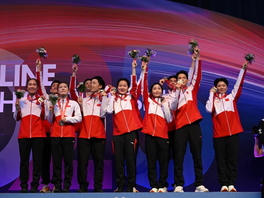 11月9日,冠军中国队在混合团体比赛颁奖仪式上庆祝。新华社发(菲利波·托马西摄)