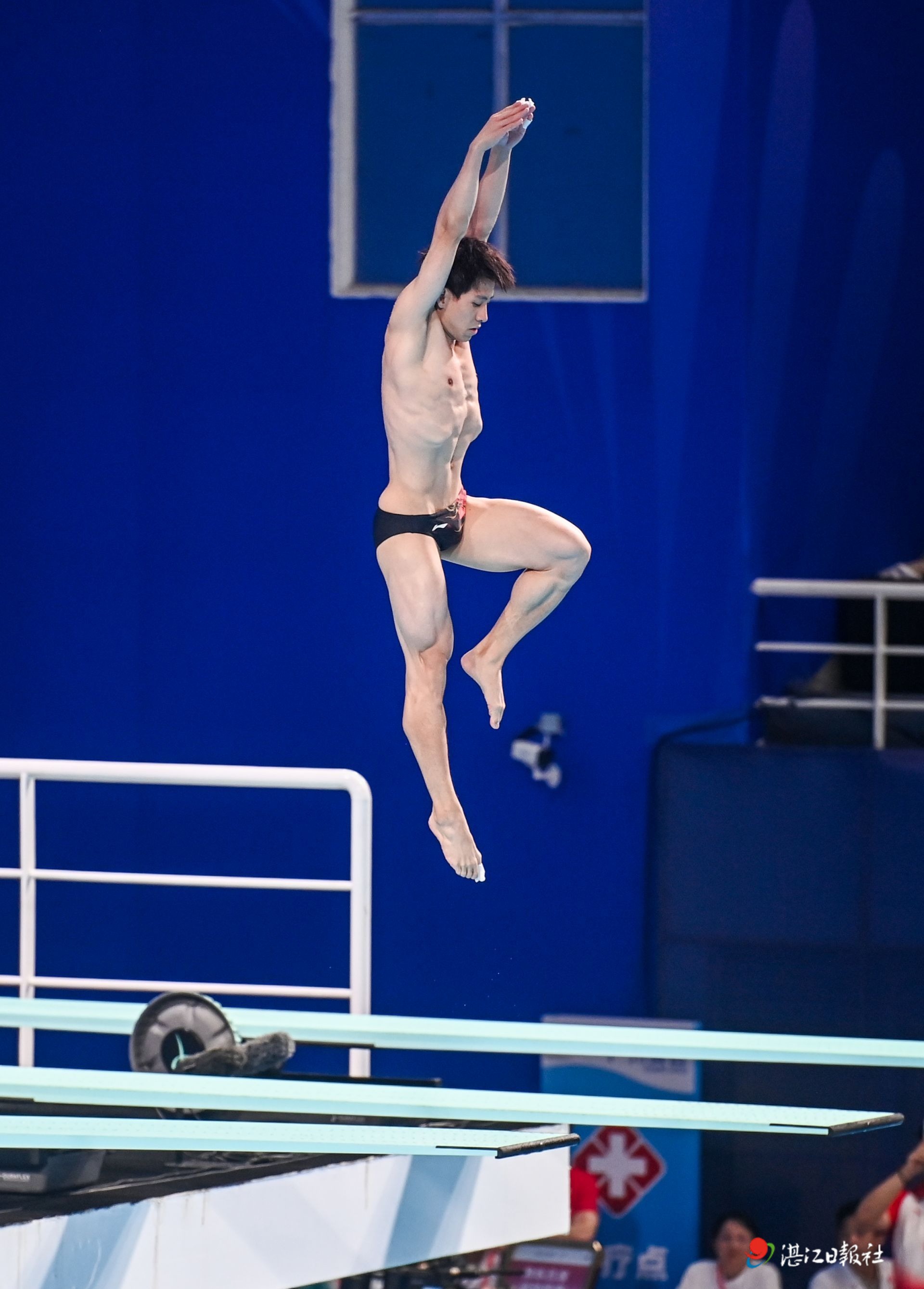 10日下午的男单3米板决赛,何超作为广东队晋级的“独苗”,和24岁湖北队名将、2024年巴黎奥运会男单3米板亚军王宗源和21岁湖北队新星郑九源等众多实力派后生展开激烈争夺。前两轮,何超得分均排第三位;第三轮和第四轮,何超得分降至第四位;第五轮,何超奋起直追,又上升到第三位;最后一轮,何超顶住压力,跳出96.90分的高分,最终以总分489.70分获得第三名。湖北队选手王宗源以总分549.85分获得冠军,湖北队选手郑九源以总分510.60分获得亚军。