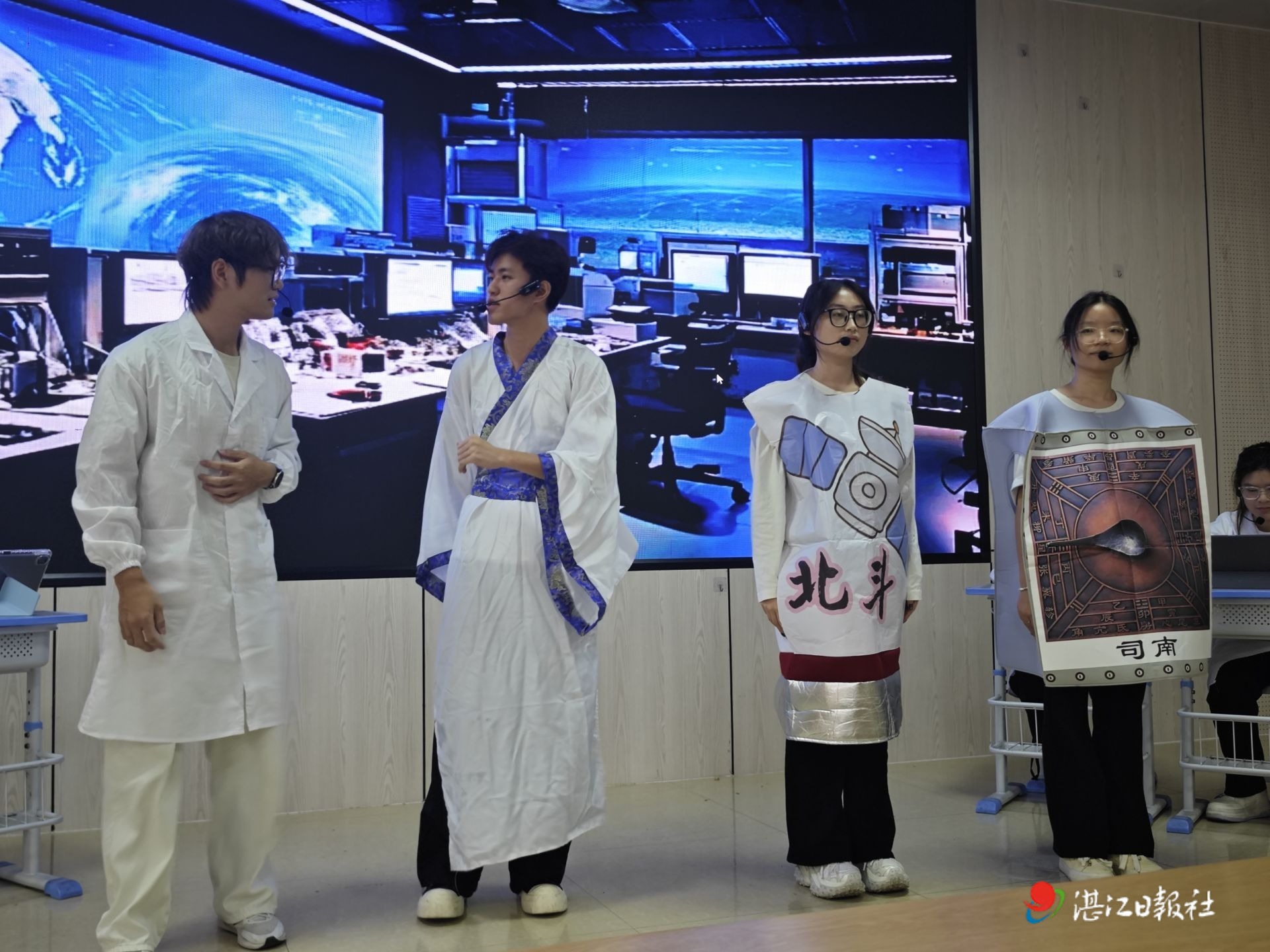 活动现场,岭师物理科学与技术学院学生团队带来的科普秀点燃全场:液氮喷雾化作 “仙气”、塑料袋火箭直冲云霄、掌心火焰安全燃烧等趣味实验,将抽象的理化知识变得直观易懂,引发学生阵阵惊呼。科普剧《司南北斗,照亮千年航道》通过古今对话,讲述司南到北斗系统的科技演进,传递 “自主创新才能强国” 的理念,让科学精神与家国情怀深入人心。