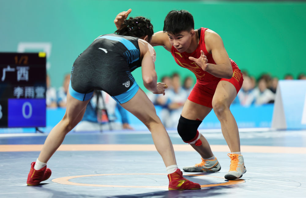 11月10日,江苏队选手张金(右)与广西队选手李雨萱在比赛中。最终,张金获胜晋级决赛。当日,第十五届全国运动会摔跤女子自由式53公斤级半决赛在广东清远举行。新华社记者 李然 摄