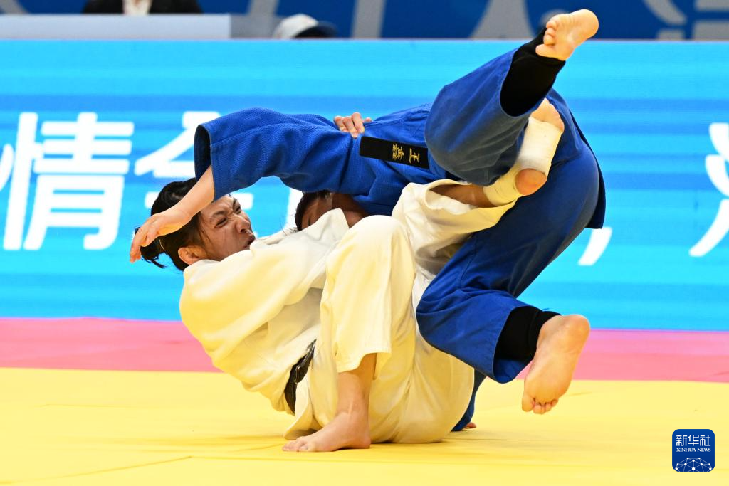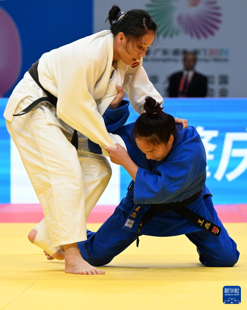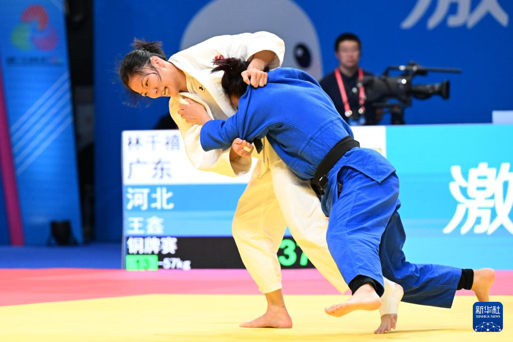 11月10日,广东队选手、湛江籍运动员林千禧(穿白衣者)战胜河北队选手王鑫(穿蓝衣者),夺得十五运会柔道女子57公斤级铜牌。(新华社图片)