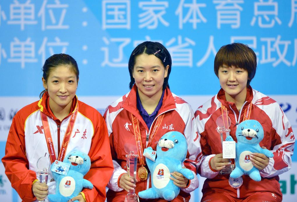 2013年9月10日,分别获得前三名的李晓霞(中)、陈梦(右)与刘诗雯在第十二届全国运动会乒乓球女子单打颁奖仪式上。新华社记者 朱峥 摄