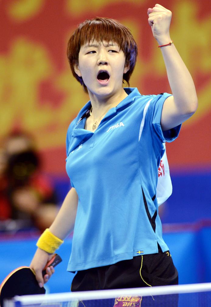 2013年9月5日,陈梦在第十二届全国运动会乒乓球女子团体决赛中庆祝得分。山东队以3比0的总比分战胜山西队,获得冠军。新华社记者 朱峥 摄