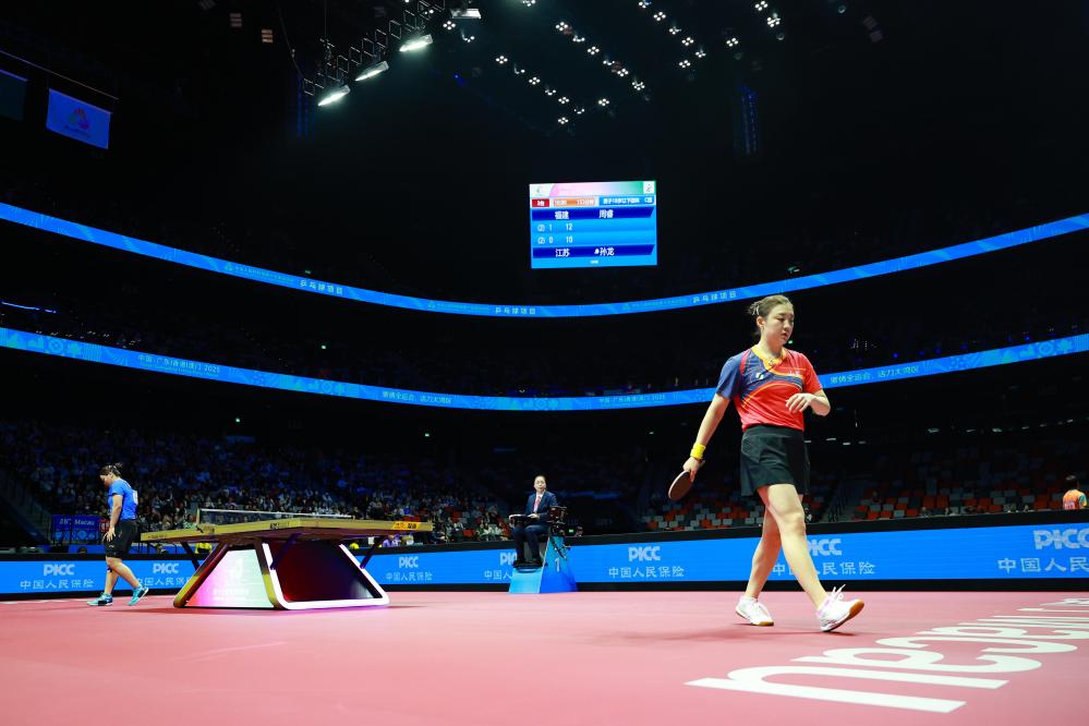 2025年11月11日,陈梦(右)在第十五届全国运动会乒乓球女子单打1/16决赛中。新华社记者 刘续 摄
