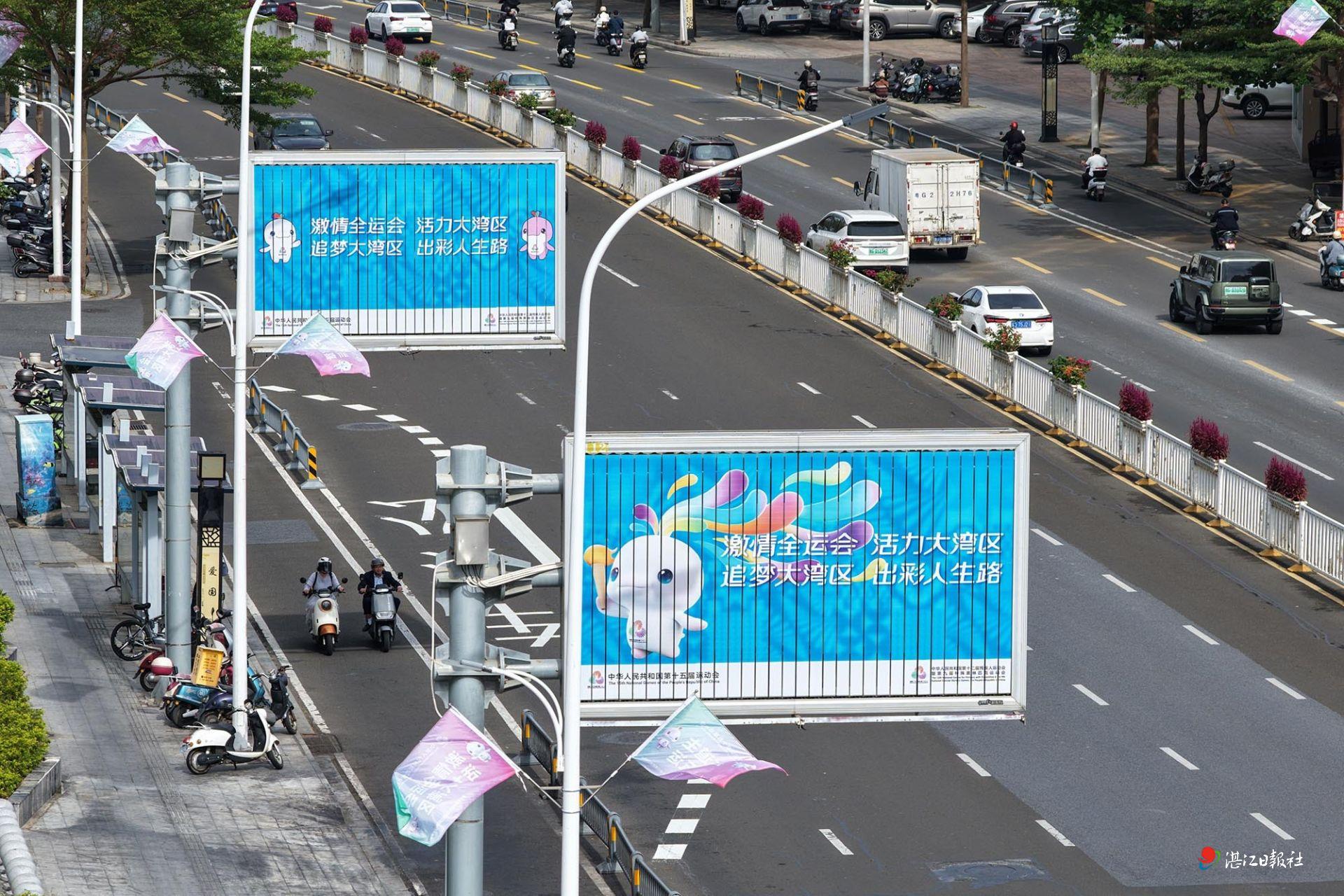在湛江市体育中心门前,原本的十五运会宣传牌更新了画面,“激情全运会 活力大湾区 湛江欢迎您”的标语格外醒目。