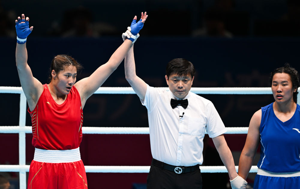 11月12日,裁判宣布汪丽娜(左)获得本场比赛胜利。新华社记者 杨冠宇 摄