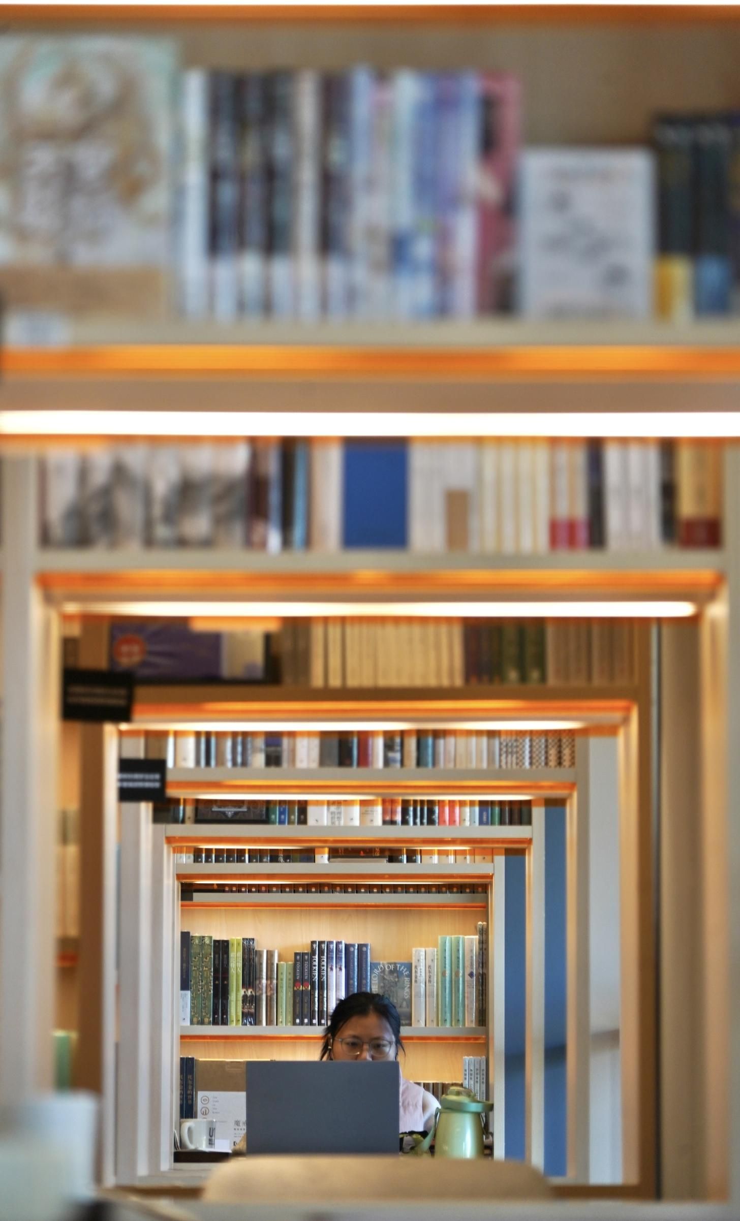 宣南书店(法源寺店)位于西城区烂缦胡同南口,记者探访时发现,即便平日,这里也几乎座无虚席,室内室外、楼上楼下、露台上都有各路读者纷至沓来。店内,有附近居民带着孩子在书架前寻找图书的,有老街坊一起相约读书的,也有在电脑前一直投入工作的上班族。王玉是一名家教,再过两个小时要上门教英语课,她总会利用这个空当喝一杯咖啡看一本书,再隔着落地窗看着大街上的人来人往。她说,这是在给自己充电。正在中国戏曲学院读研的晓玲说,这种充满烟火气的氛围令她惬意,“我喜欢有一些人、有一些细小的噪音在旁边,这会让我更专注。”此时,晓玲正在阅读一本英文原版童书,还一边做着笔记,她希望通过阅读英文原版读物提升英语水平。