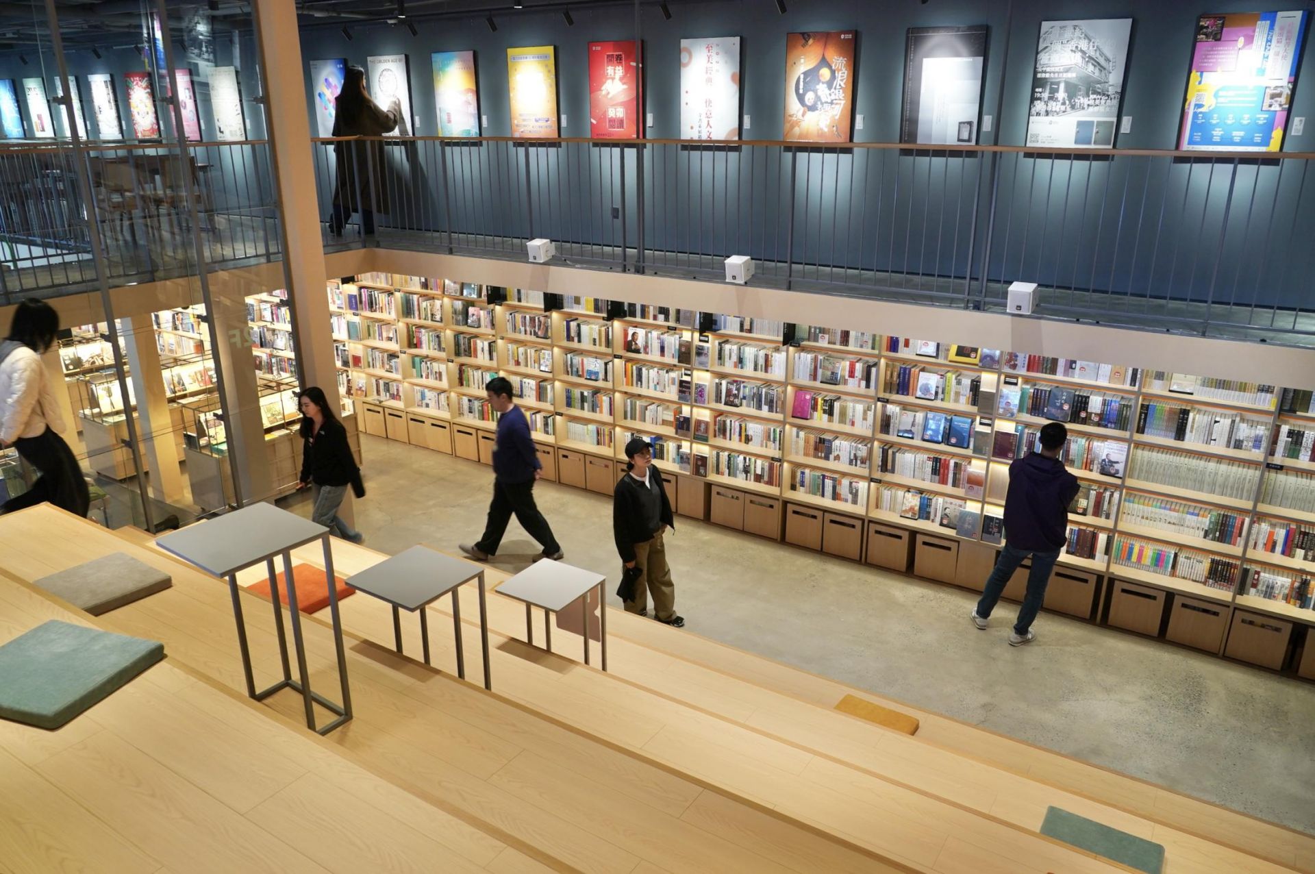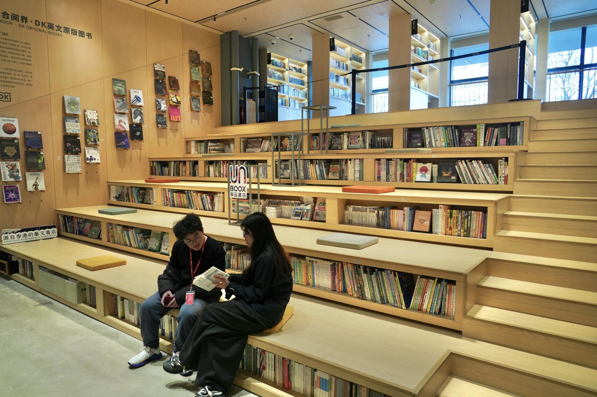 书店特展区展出数量高达1100册的DK英美版的原版样书,全部可供大小读者拆阅,这些读物置身于阶梯中,小读者坐下来,就能轻松寻找和归还。书店艺术展览区则展出“好书好报,纸上霓虹”香港联合出版集团图书海报设计展,每一本书呈现设计心语,给观者带来启发。
