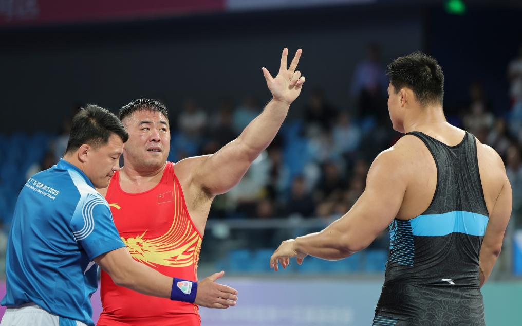 三连冠!12日,在第十五届全运会男子自由式摔跤125公斤级决赛现场,37岁的邓志伟高举双手,比出“3”的手势。