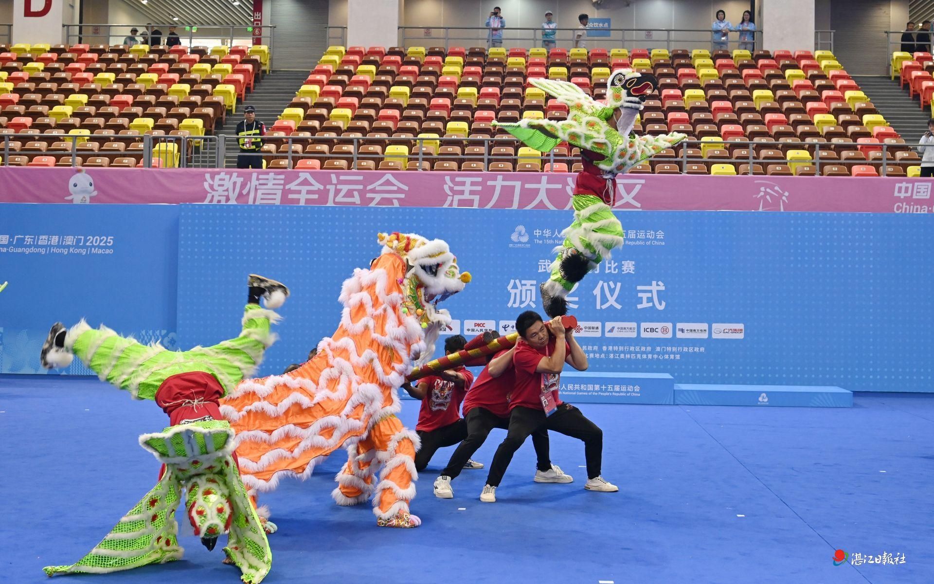 暖场表演中,被誉为湛江非遗“三绝”的遂溪醒狮、调顺网龙和舞鹰雄次第登场。来自遂溪御唐府河头群兴龙狮团的队员们带来了一段《群狮贺盛会·空中飞狮》的震撼表演。雄狮表演“空中探海”“倒挂金钩”等一系列高难度动作,引得现场惊呼与掌声不断。团长林长贵介绍,这是遂溪醒狮在保留传统精髓基础上,大胆突破表演空间的一次成功尝试,希望用这种更具冲击力和观赏性的形式,向全国乃至全世界的朋友,展示遂溪醒狮不断创新、勇于挑战的独特魅力。