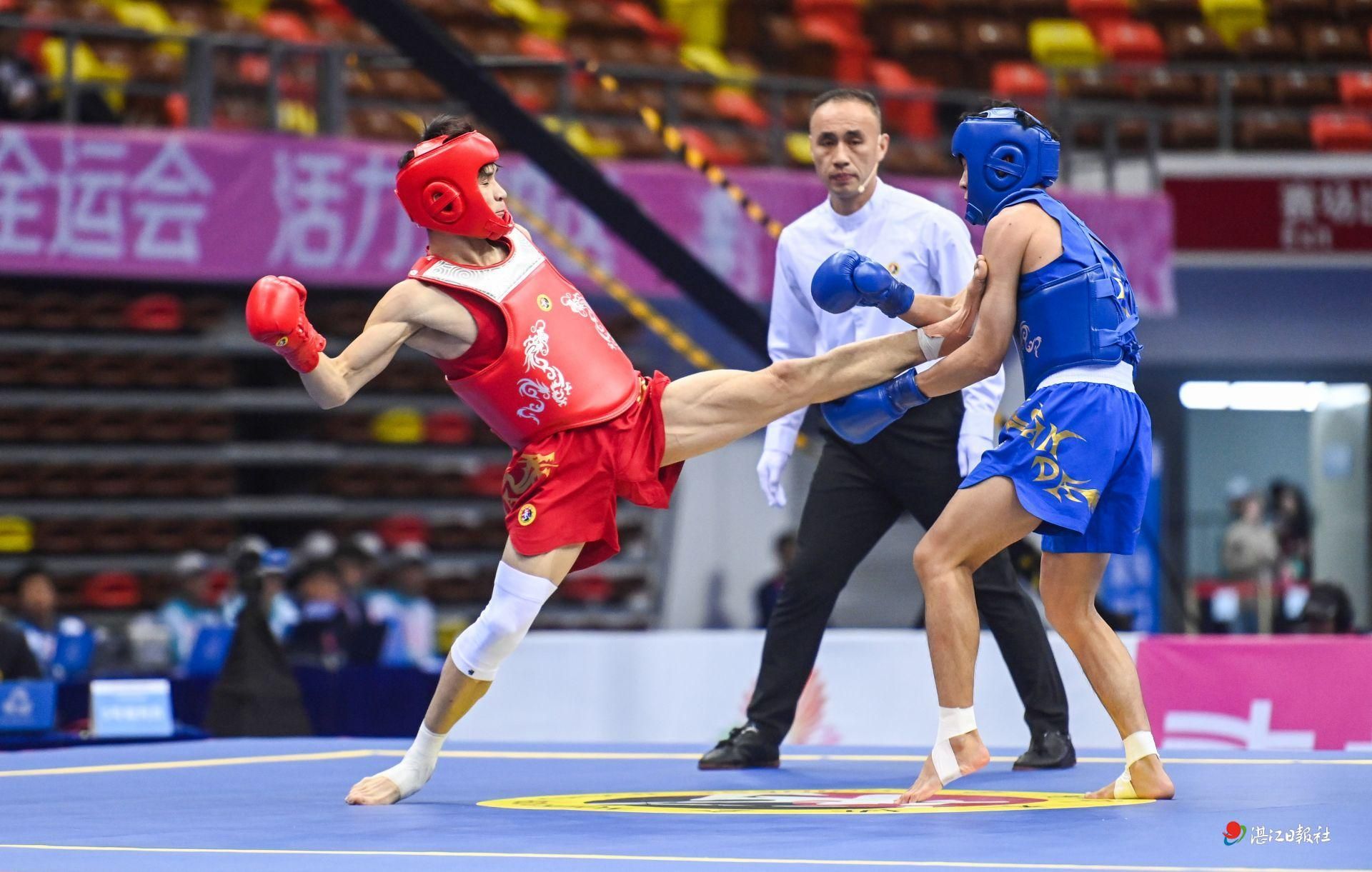 十五运会散打男子60公斤级1/8决赛,“湛将”王艺霖(红方)晋级八强。 记者 郎树臣 摄