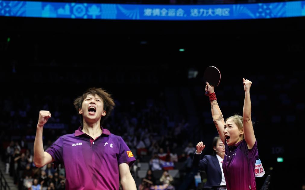 11月14日,广东队组合林高远(左)/刘诗雯庆祝夺冠。新华社记者 孙凡越 摄