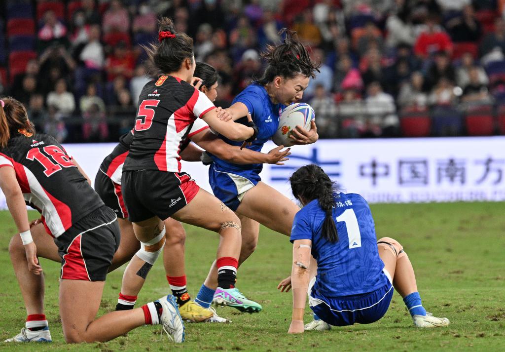 女子组方面,江苏队胡宇率先达阵得分,队友陈可怡追加射门命中。此后,江苏队逐渐扩大优势,最终以35:12战胜山东队。