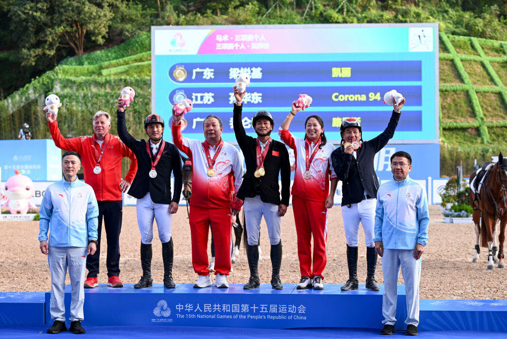 新华社深圳11月15日电(记者黄耀漫)15日,第十五届全国运动会马术项目决出三项赛团体和个人两枚金牌,广东队成为最大赢家,不仅夺得三项赛团体金牌,老将梁锐基还将三项赛个人金牌收入囊中。