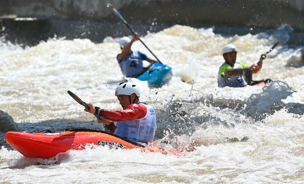 2021年9月12日,福建队选手全鑫(前)在决赛中。当日,在四川省攀枝花市米易县举行的第十四届全运会皮划艇激流回旋男子极限皮艇比赛中,福建队选手全鑫夺得金牌。新华社记者 胥冰洁 摄