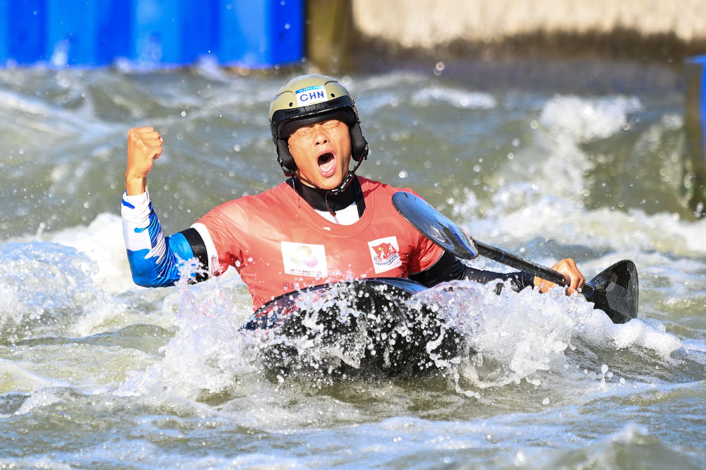 11月15日,福建队选手全鑫在赛后庆祝胜利。当日,第十五届全国运动会皮划艇激流回旋项目男子极限皮艇决赛在广州举行。新华社记者 唐奕 摄