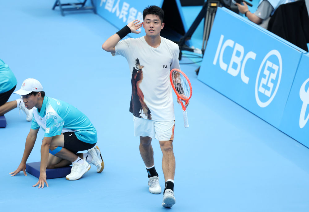 9月21日,在浙江杭州进行的男子职业网球协会(ATP)250杭州网球公开赛单打四分之一决赛中,中国选手吴易昺2:1战胜俄罗斯选手梅德韦杰夫,晋级四强,图为中国选手吴易昺庆祝获胜。新华社记者 黄宗治 摄