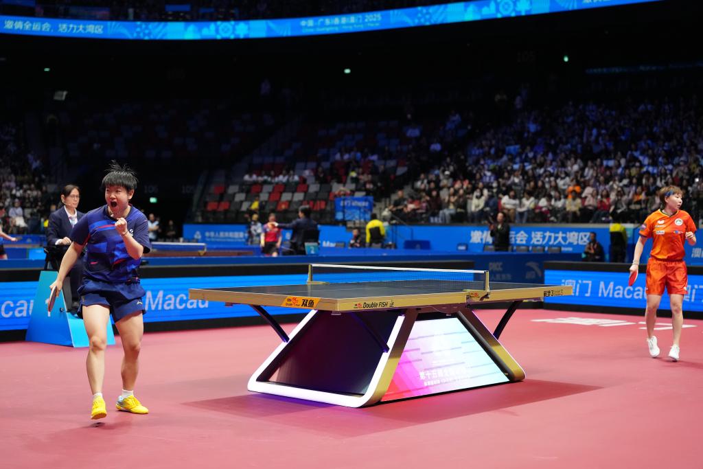 15日,第十五届全运会乒乓球女单半决赛结束,河北队孙颖莎、黑龙江队王曼昱晋级决赛。她们分别以4:1、4:0的比分战胜了澳门队朱雨玲和山东队陈梦。