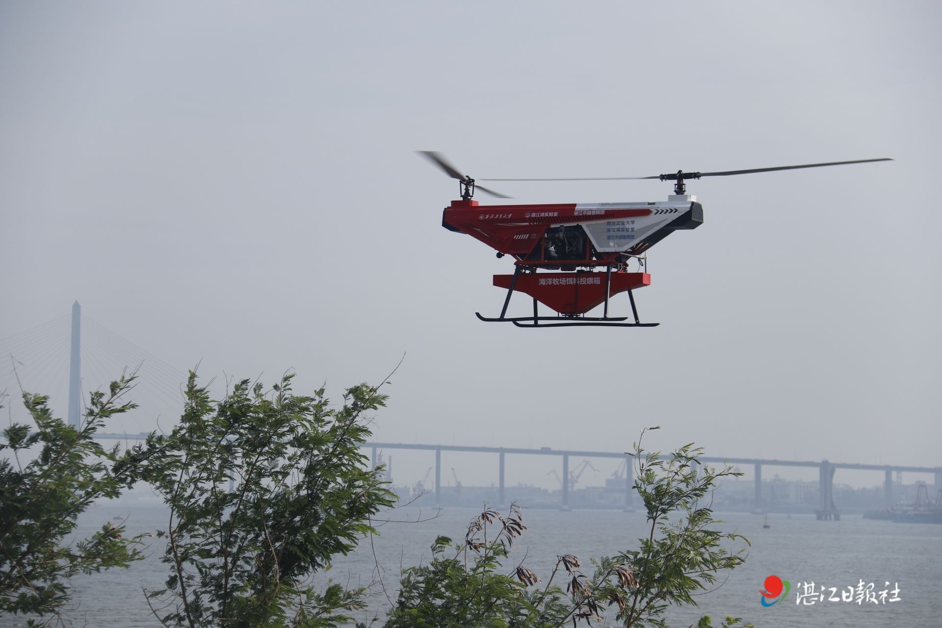 首飞现场,天气晴好,无人机NWPU-ZJBL-01顺利完成垂起动作,并挂载“海洋牧场饵料投喂箱”进行鱼饵抛洒作业演示。湛江湾实验室科研发展部副部长吴永鹏介绍,此次首飞的无人机具备体积小、载重能力强、重心范围大、可挂载空间多、续航长等优势,拥有高精度定位与智能吊挂系统和多模态悬停控制算法,确保饲料投喂精准。“本次首飞主要是性能验证,将为后续更多应用场景的联合研究奠定基础,为湛江低空经济产业创新发展提供技术保障。”