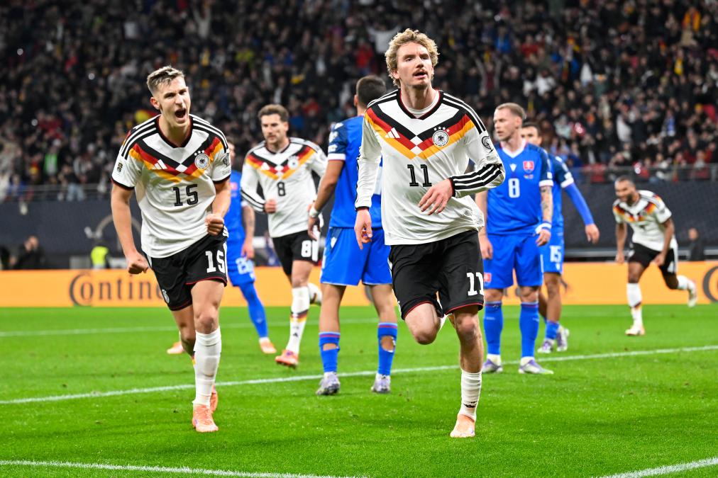11月17日,德国队球员沃尔特马德(前右)庆祝进球。当日,在德国莱比锡举行的2026年美加墨世界杯欧洲区预选赛第一阶段小组赛第十轮比赛中,德国队主场6:0战胜斯洛伐克队。新华社发(乌尔里希·胡夫纳格尔摄)