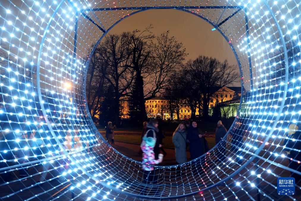11月17日,民众在拉脱维亚首都里加举行的灯光节上欣赏灯光艺术装置。