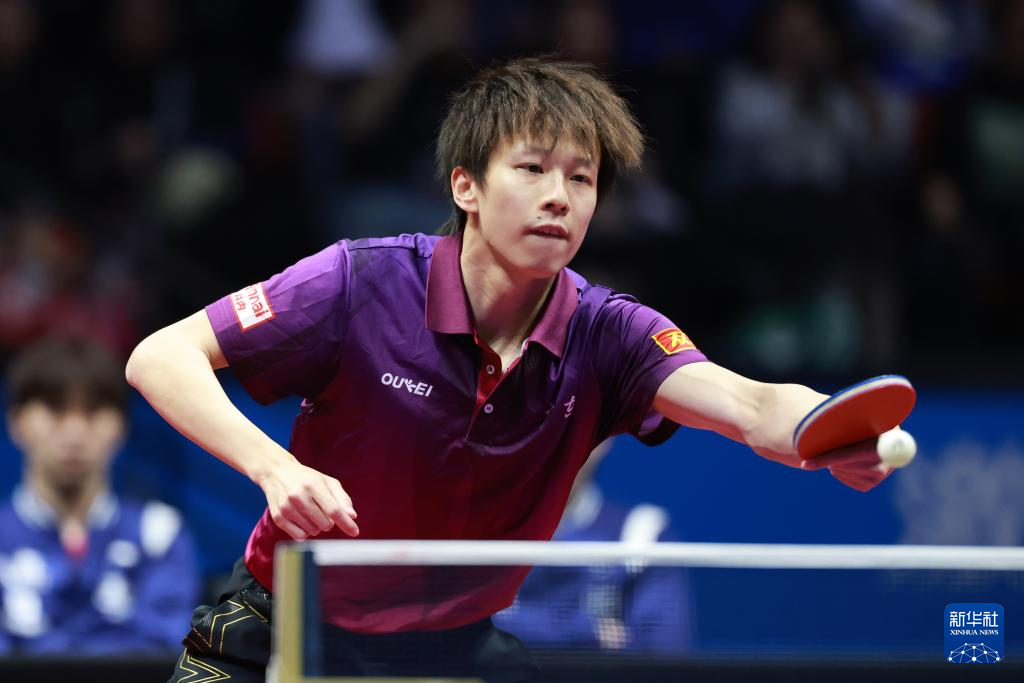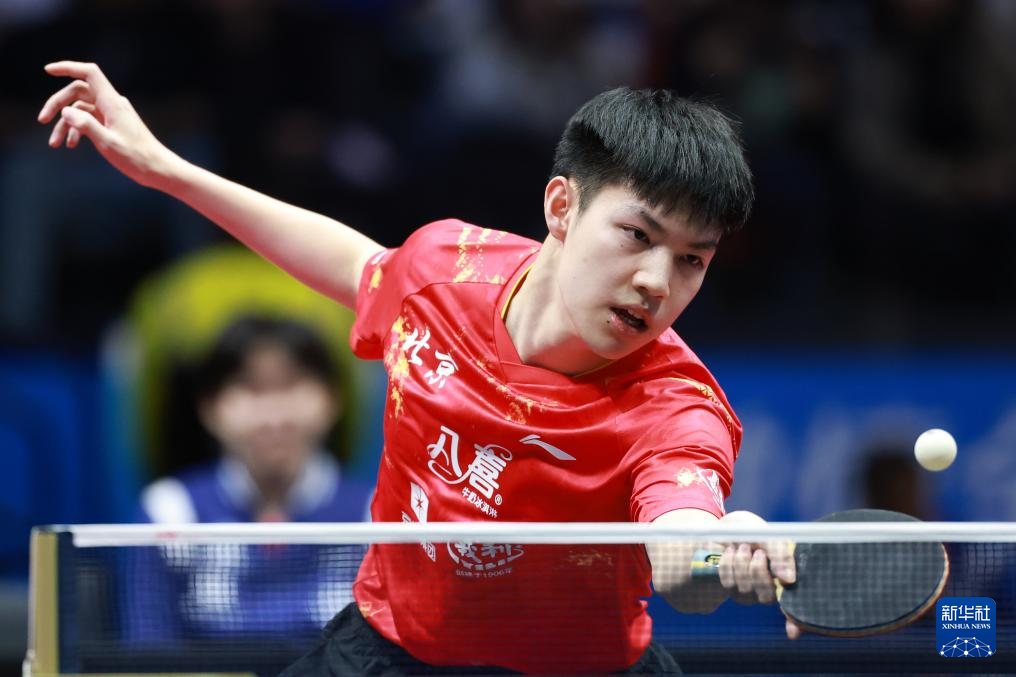 11月18日,北京队选手王楚钦在男单比赛中回球。最终,他3比0战胜广东队选手李艺杰。
