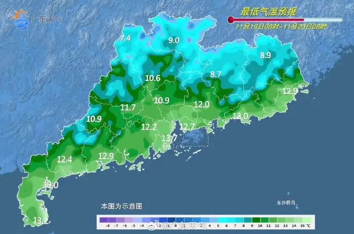 ☁20日,粤北市县多云间阴天,其余市县阴天或零星小雨转多云。最低气温:粤北偏北市县5~8℃(粤北高海拔山区2~5℃),粤北其余市县和珠江三角洲北部市县8~10℃,南部沿海市县13~16℃,其余市县10~13℃。