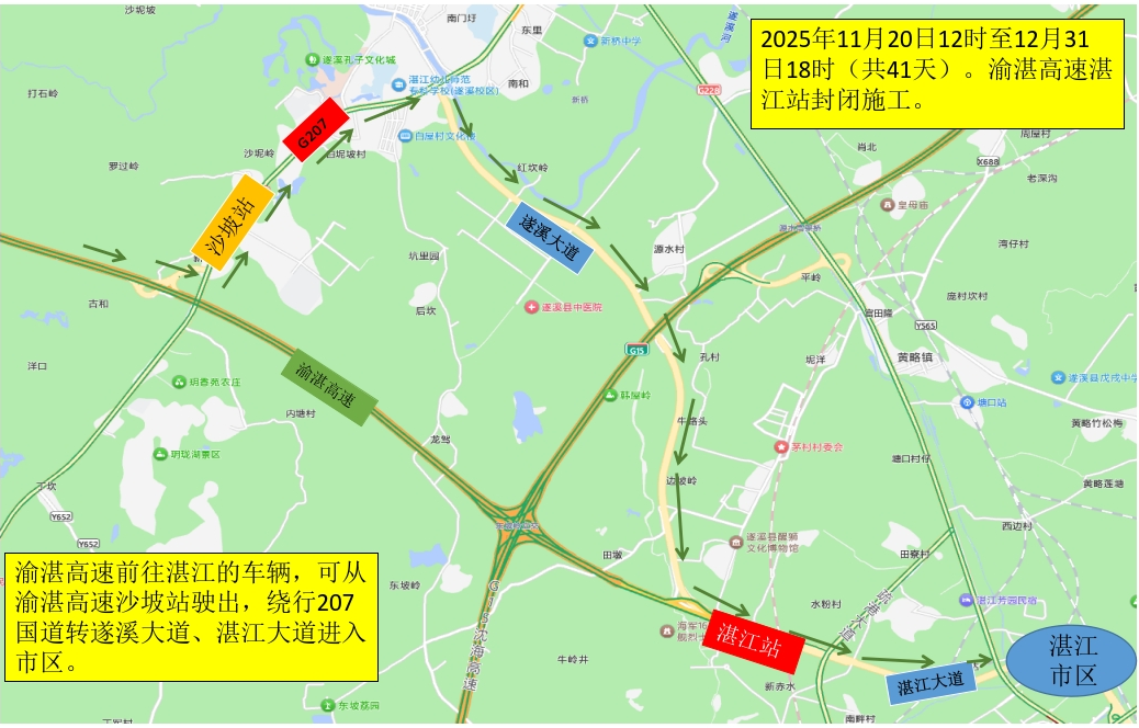 记者从广东交通集团获悉,因改造施工需要,渝湛高速湛江站将于2025年11月20日12时至12月31日18时实施全封闭临时交通管制,管制时长41天。