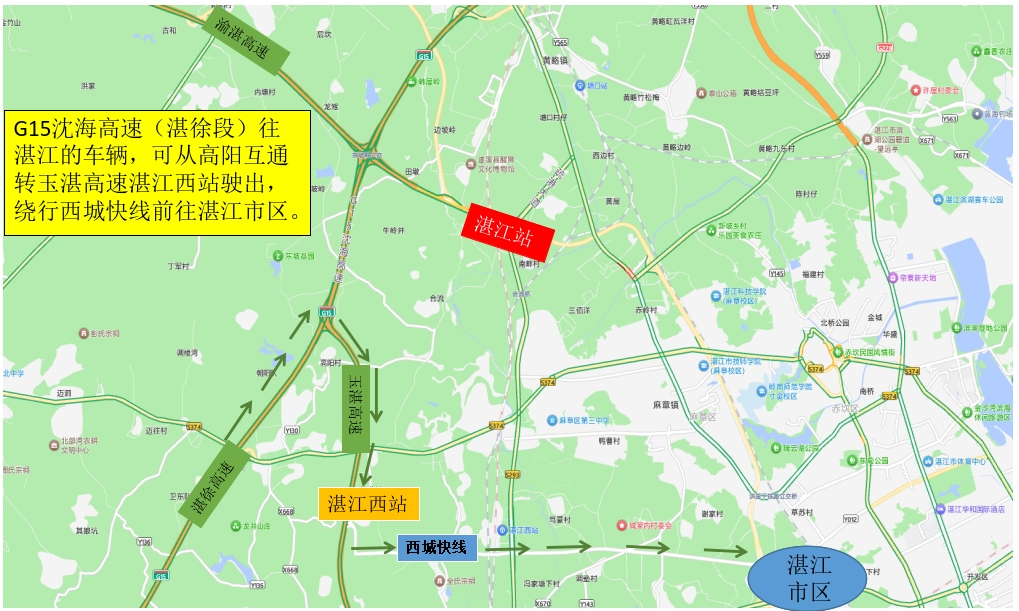 为保障通行,相关部门发布绕行建议:渝湛高速往湛江方向车辆,可从沙坡站驶出绕行207国道转遂溪大道、湛江大道,或从玉湛高速湛江西站驶出绕行西城快线;G15沈海高速(茂湛段)前往湛江站车辆,可从源水站驶出绕行228国道转疏港大道,或从沙坡站驶出绕行207国道转遂溪大道;G15沈海高速(湛徐段)往湛江车辆,可从高阳互通转玉湛高速湛江西站驶出绕行西城快线;需进入高速的车辆,可从沙坡站或源水站驶入。