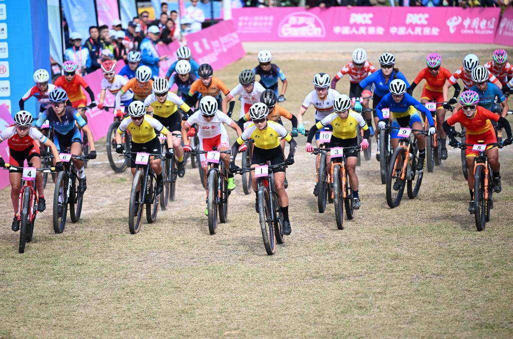 11月20日,在广东江门举行的第十五届全国运动会山地自行车女子越野赛决赛中,江苏队选手魏钱钱获得冠军,云南队选手伍志帆、梁正兰分别获得亚军、季军。新华社记者 陈钟昊 摄