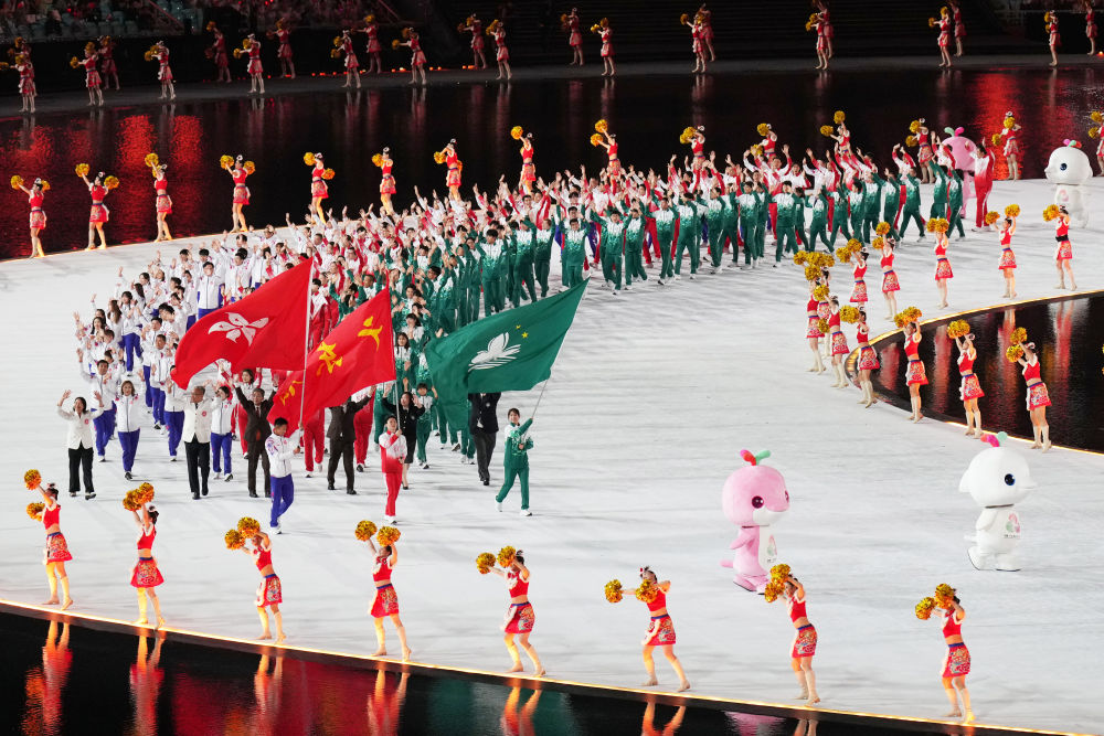 ↑11月9日,广东省体育代表团、香港特别行政区体育代表团和澳门特别行政区体育代表团在入场仪式上共同入场。