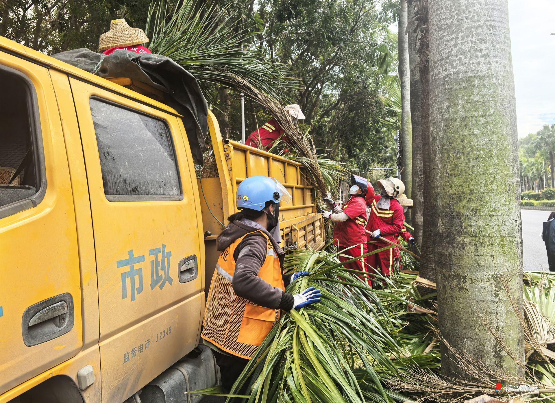 当日上午,工人已完成该路段大王椰干枯枝条的修剪工作,午后便迅速投入清运工作中。现场,身着作业服的工作人员分工协作,将修剪下的枯枝有序搬运至作业车辆(如图),动作娴熟高效。此次作业不仅及时消除了干枯枝条掉落砸伤过往行人和车辆的安全隐患,还进一步维护了道路沿线的绿化环境整洁。