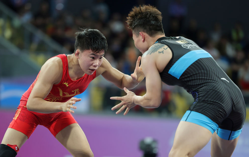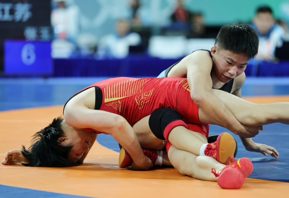 11月10日,江苏队选手张金(左)与湖南队选手庞倩玉在女子自由式53公斤级决赛中。最终,江苏队选手张金、湖南队选手庞倩玉分获冠、亚军。 新华社记者 李然 摄