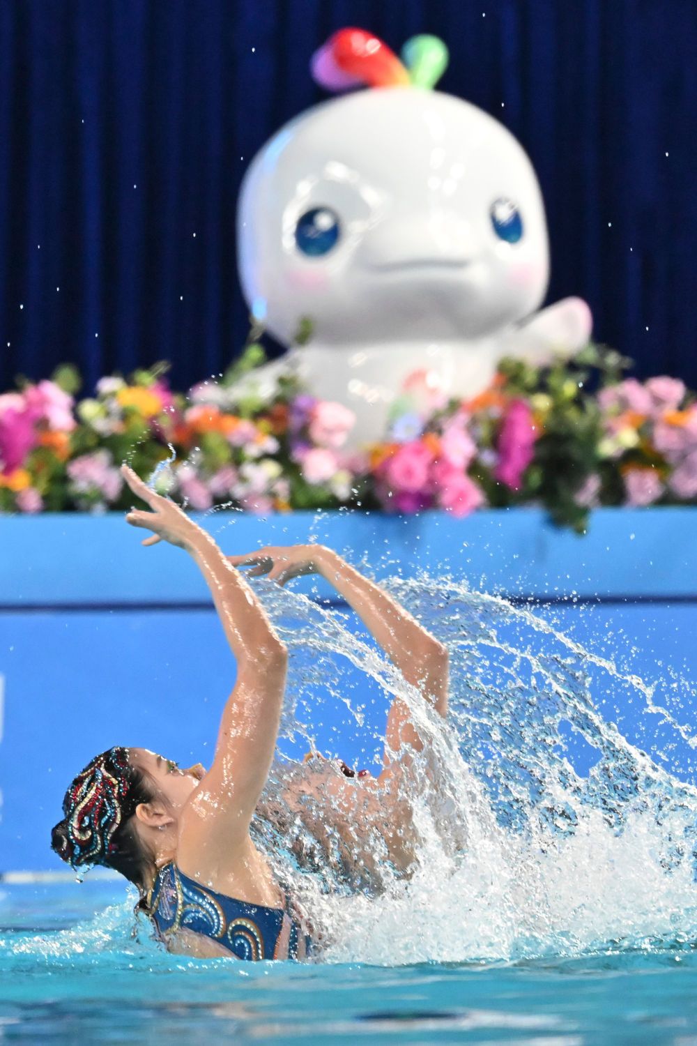 伴随着优美或铿锵的音乐,双人项目里的三对“姐妹花”如并蒂而生的莲:水中倒立时,她们伸出水面的双腿形态、节奏、动作几乎完全一致;长达三四十秒的水下高强度憋气后,两张探出水面的脸美得同样惊心动魄,连神情都出奇一致。