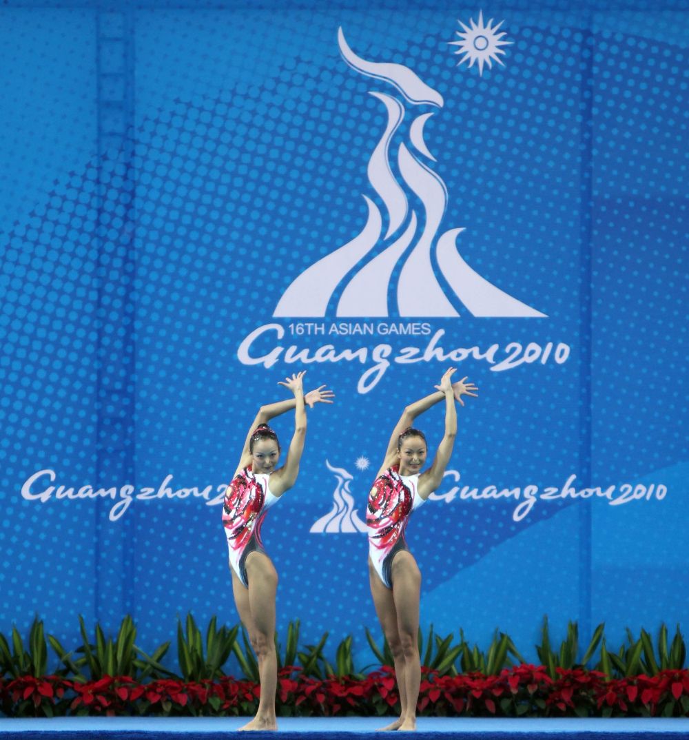 2010年11月19日,中国选手蒋婷婷/蒋文文在佛山进行的广州亚运会花样游泳双人技术自选比赛中。新华社记者 费茂华 摄