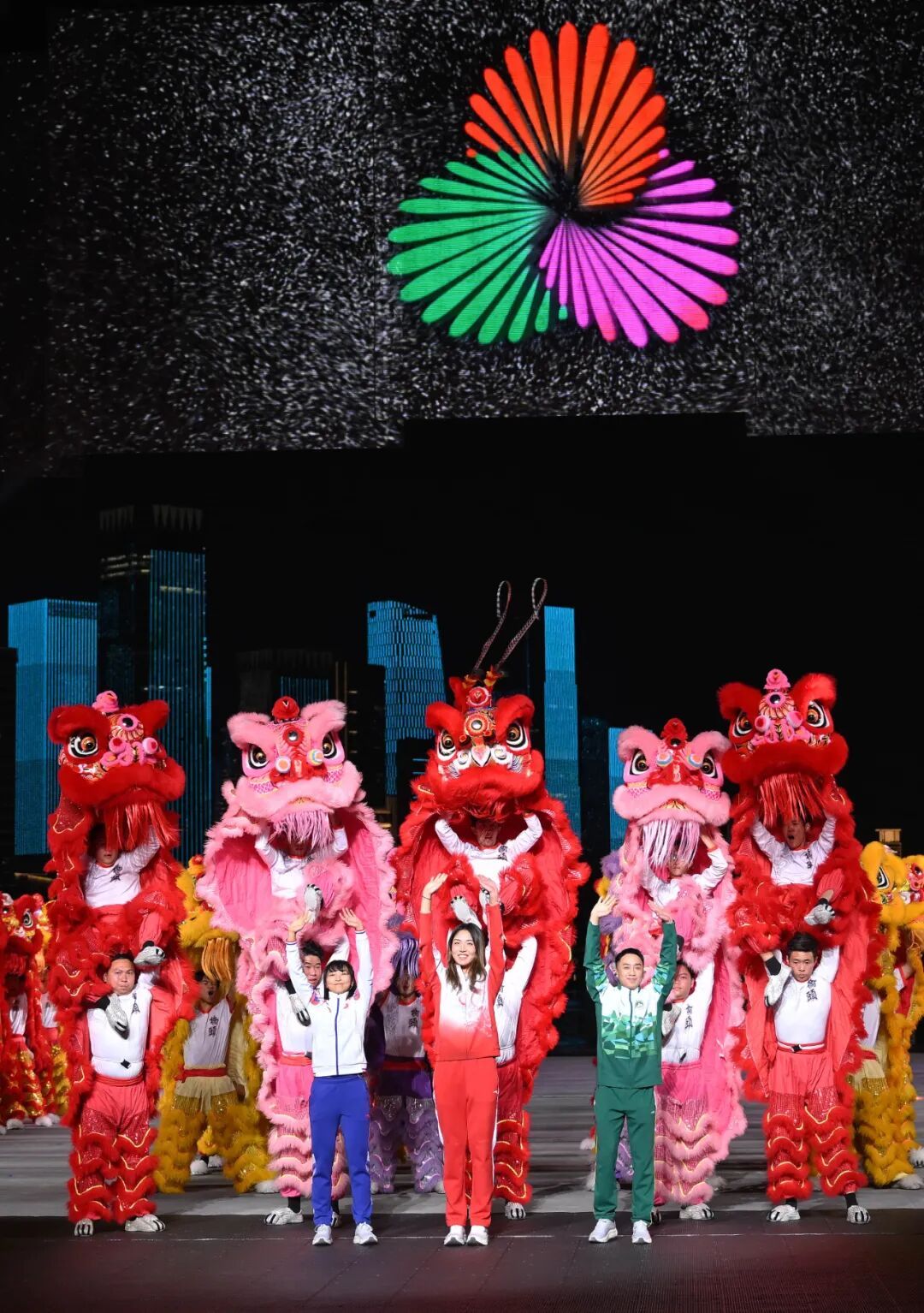 11月21日,广东队运动员王欣瑜(前中)、香港队运动员李思颖(前左)和澳门队运动员郭建恒(前右)在闭幕式现场。新华社记者 张龙 摄