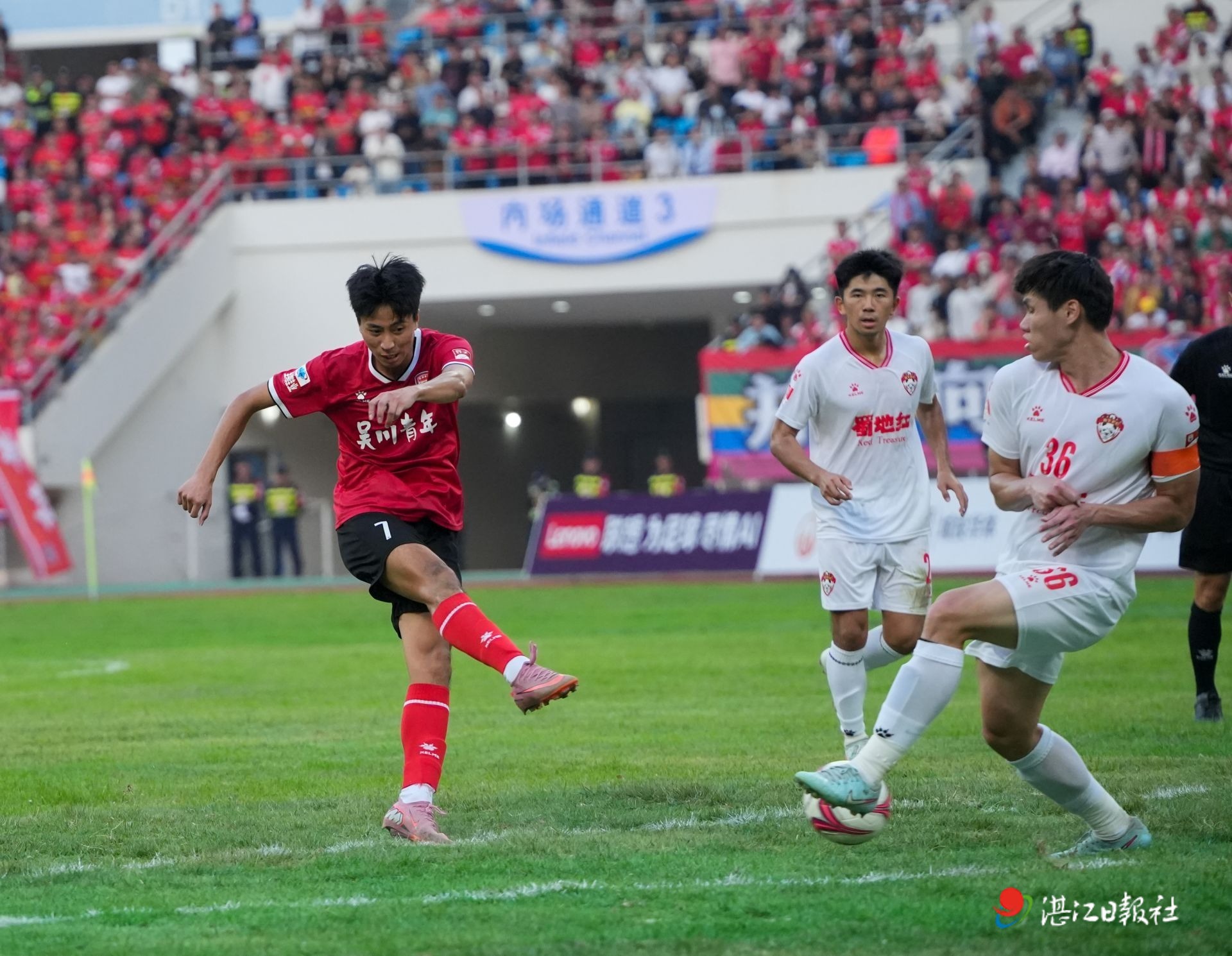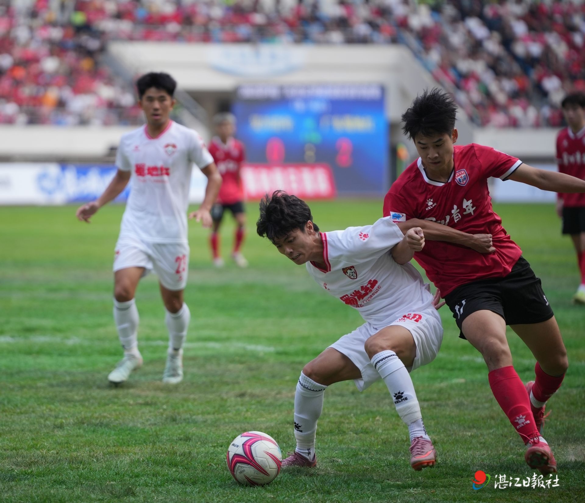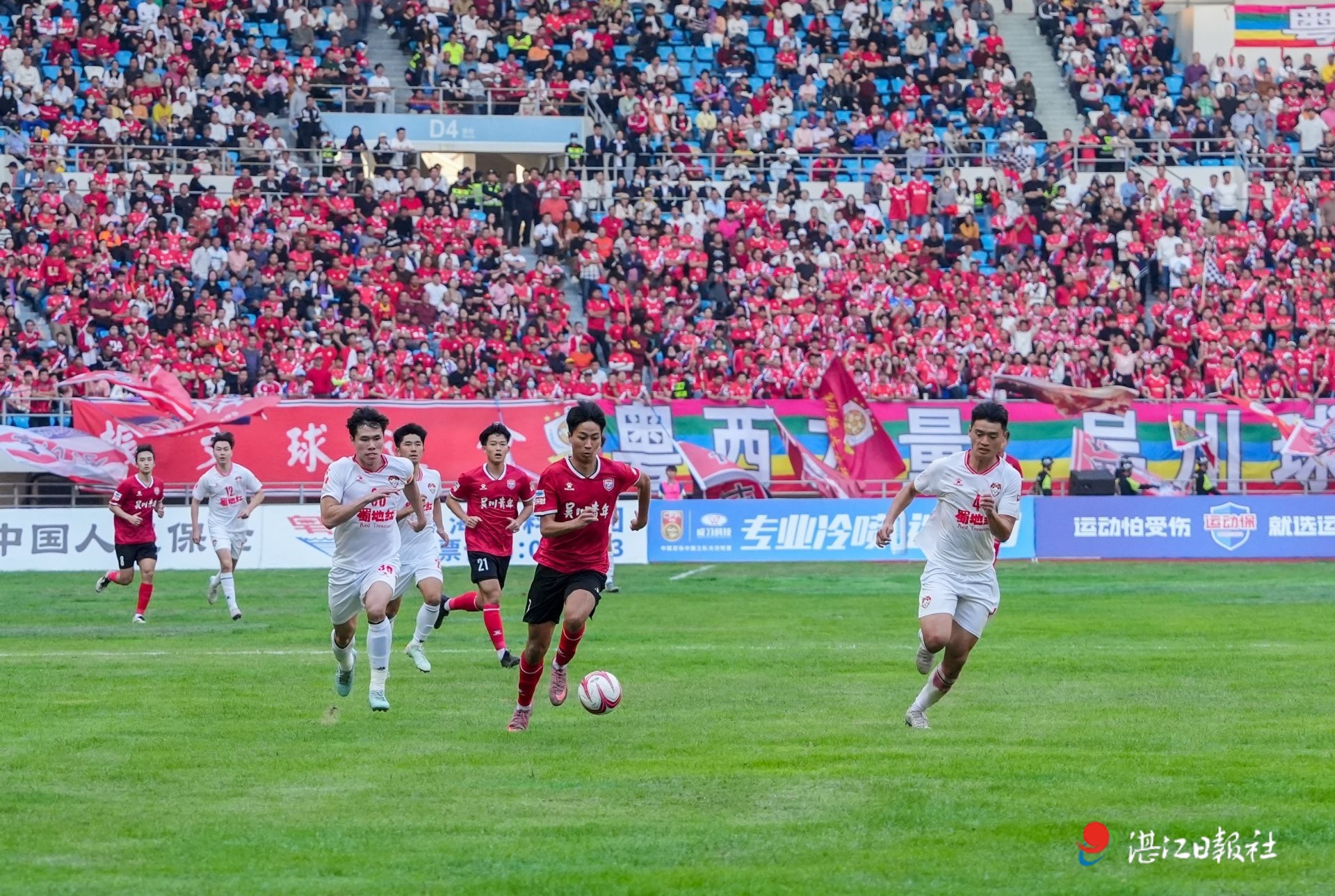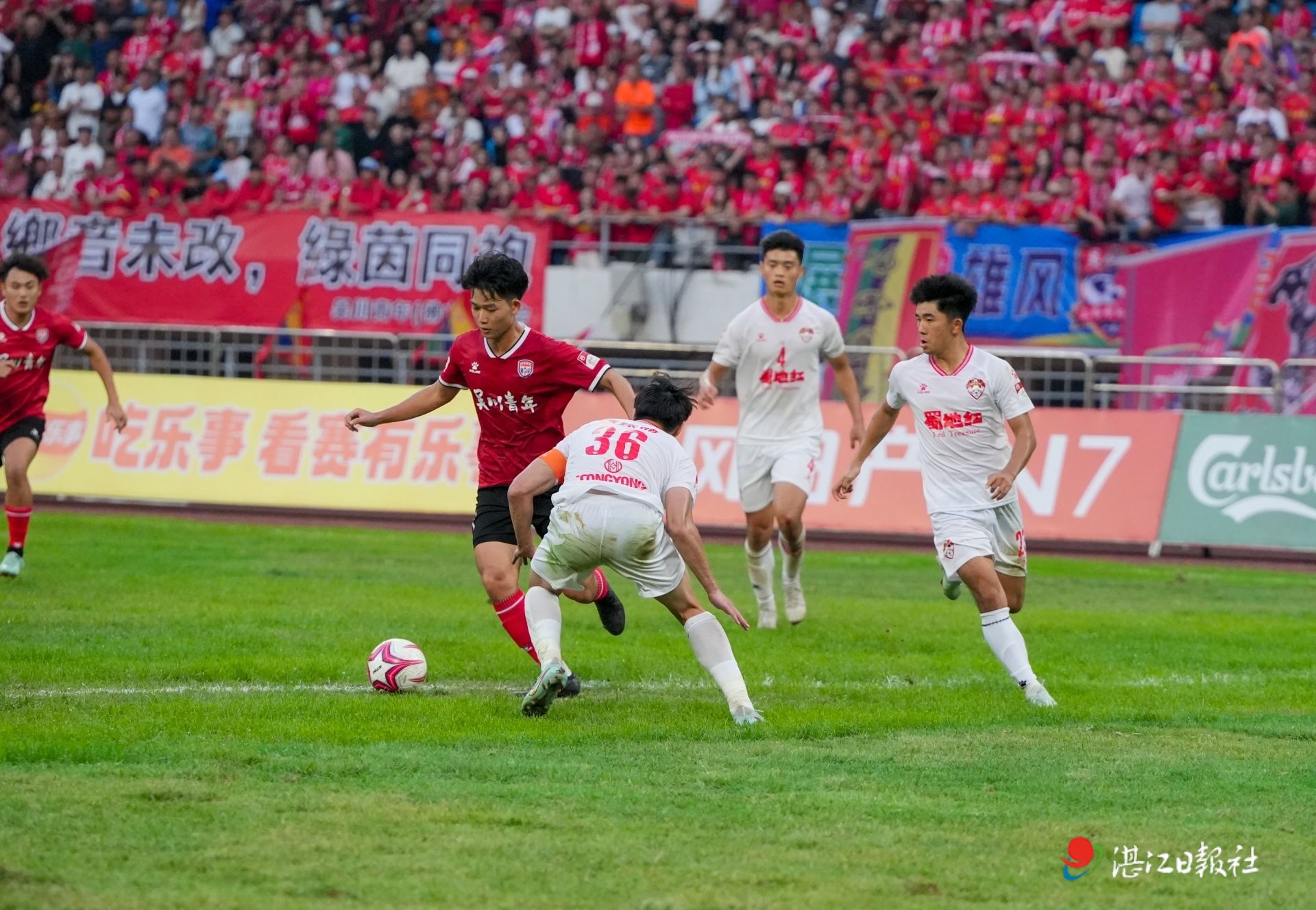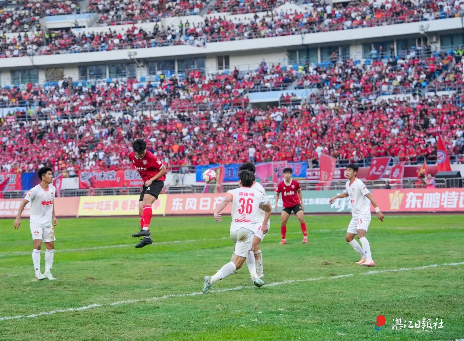 11月23日,2025广东省足球超级联赛半决赛第一回合广东吴川青年队主场与广东蜀地红队的比赛在湛江奥林匹克体育中心主体育场举行。在3万多名球迷的热情加油助威声中,广东吴川青年队在上半场0:2落后的不利局面下,顽强拼搏,最终以2:2战平对手。