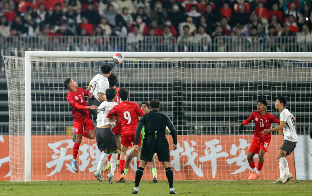 11月22日,中国队球员帅惟浩(上)在比赛中头球破门。新华社记者 黄伟 摄