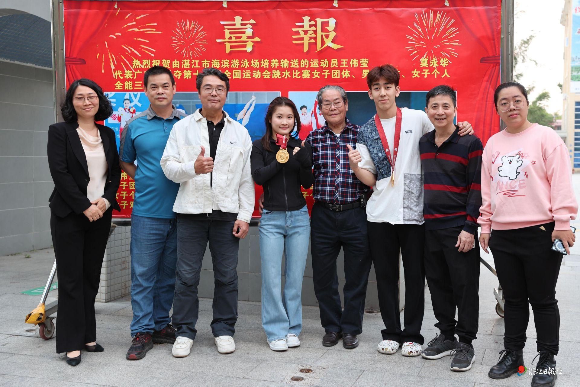 “欢迎‘回家’!”11月24日下午,第十五届全国运动会跳水项目冠军王伟莹、郑钧之,在场馆工作人员的欢呼声中,重返游泳启蒙与培养基地——湛江市海滨游泳场,与久别重逢的教练们畅叙深厚情谊。