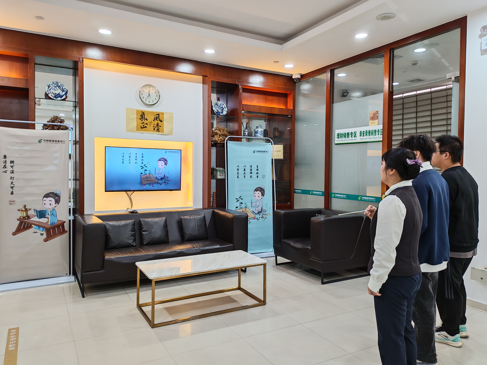 阵地赋能,以场景润人心。该行以营业网点为核心阵地,围绕“沉浸式清廉熏陶”理念,在人流量密集区域打造特色廉洁文化空间,让清廉气息触手可及。在营业大厅显著位置,“廉洁文化展架”格外醒目,展架上“粥可温灯火可亲廉洁在心”主题古风漫画海报,将传统廉洁美德与现代金融服务场景巧妙融合,既有温度又富内涵。客户等候区的“清廉文化电子屏”循环播放“以清为美、以廉正身”系列廉洁漫画,通过直观生动的视觉呈现,让员工在日常工作中时时受教育,让客户在业务办理间隙潜移默化接受清廉文化洗礼,形成“人人讲廉洁、处处沐清风”的良好氛围。