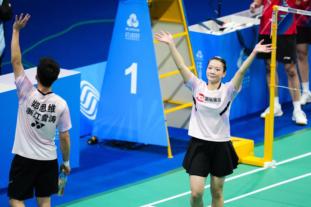 石宇奇(左)在2024年羽超联赛中搭档郭雨欣参加混合双打比赛。