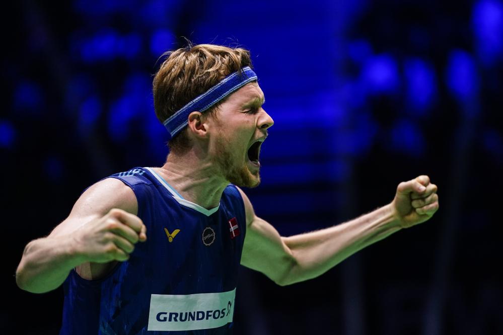 丹麦选手安东森在晋级2025年羽毛球世锦赛男子单打四强后庆祝。新华社记者 彭子洋 摄